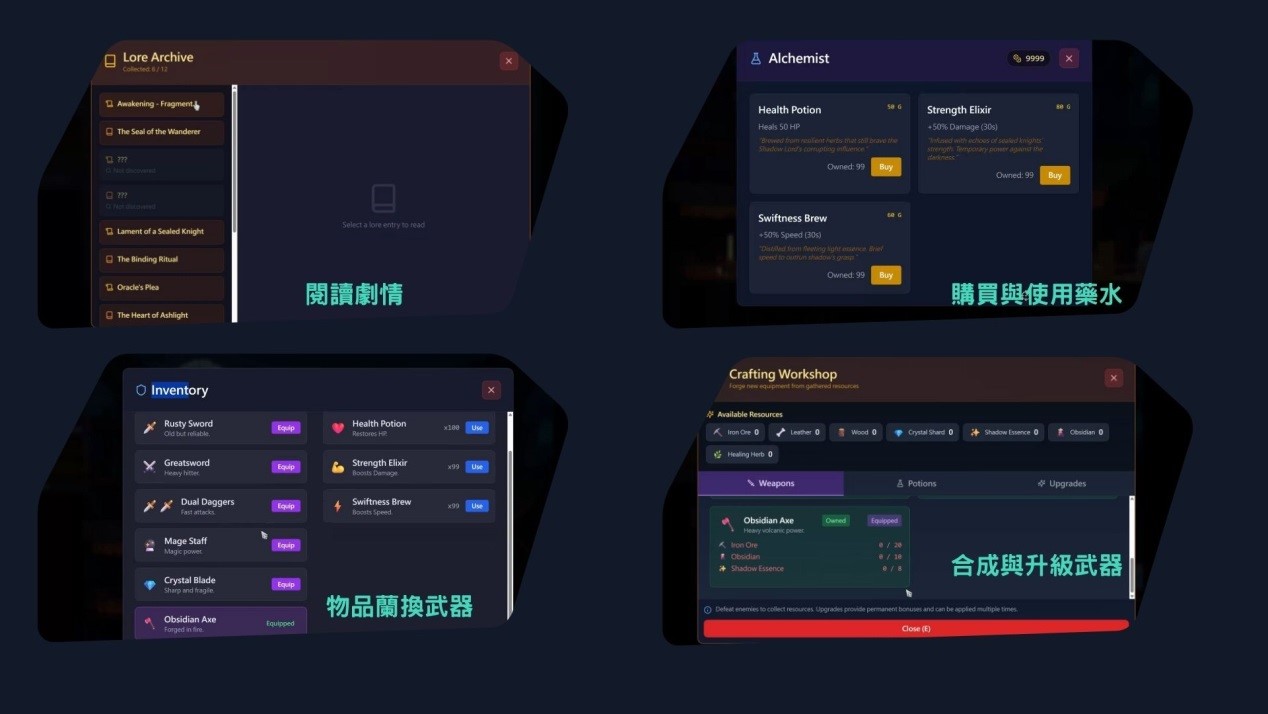 《Ashlight Castle》的互動流程包含標題畫面、主選單、關卡載入、角色死亡與重生點、敵人清除、Boss 戰與關卡完成等基本結構,並加入劇情閱讀、藥水購買與使用、物品欄管理、武器切換、合成與升級,以及技能樹系統。