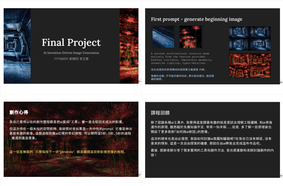 圖2 / 我的期末專案創作簡報(部分截圖)。期末呈現內容包含期末專案作品、創作過程理念以及課程心得回饋。 (圖/李芷萱)